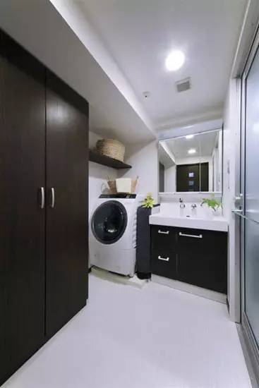 装饰Tips:对于长方形的洗漱间来说,我们应该将洗衣机放在哪里呢?洗漱台是依靠一侧墙壁摆放的,那么我们将洗衣机也放在洗漱台的一侧,靠近里面墙壁的位置,这样,将那洗衣机与洗漱台放在一侧,正好可以留出一条道,方便行走,而且放在最里面的固定的位置上,从外观色彩上来看,与洗漱台相同的白色,又令真个空间从色彩上达到了协调统一。